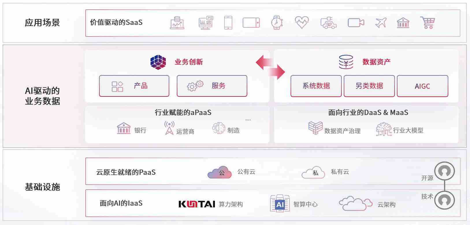 数字时代,,,围绕企业数字化转型的关键要素,,尊龙旗舰厅数码开创性的提出数云融合战略和技术体系框架,,着力在云原生、、数字原生、、、、AI原生和信创产业上架构产品和服务能力,,,为处在不同数字化转型阶段的快消零售、、、汽车、、、金融、、、医疗、、、、政企、、、、教育、、、、运营商等行业客户提供泛在的敏捷IT能力和融合的数据驱动能力,,,,构建跨界融合创新的数字业务场景和新业务模式,,助力企业级客户建立面向未来的核心能力和竞争优势,,,,全面推动社会的数字化、、智能化转型升级。。
